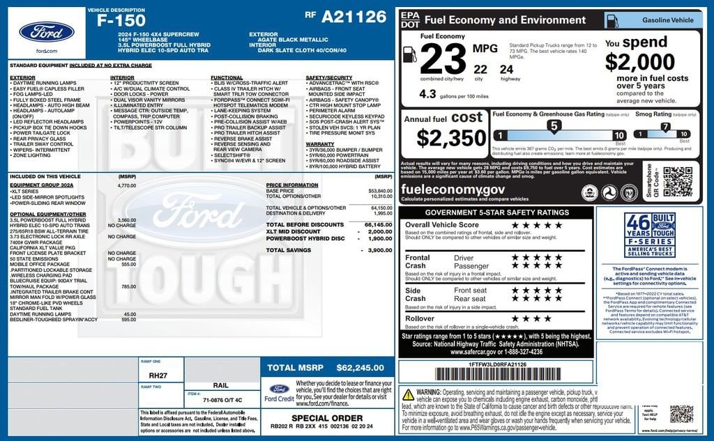 2024 Ford F-150 XLT Group 302A ($4,770 option) features a 3.5L Power Boost Full Hybrid Engine ($3,560 option) with a Tow/Haul Package ($785 option), Mobile Office Package ($555 option) and a Tough Bed Spray in Bedliner ($595 option)!