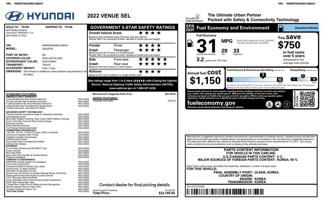 2022 Hyundai Venue SEL features a 1.6L DPI, 121 HP, 113 lbs-ft Torque, DOHC 4-Cylinder Engine!