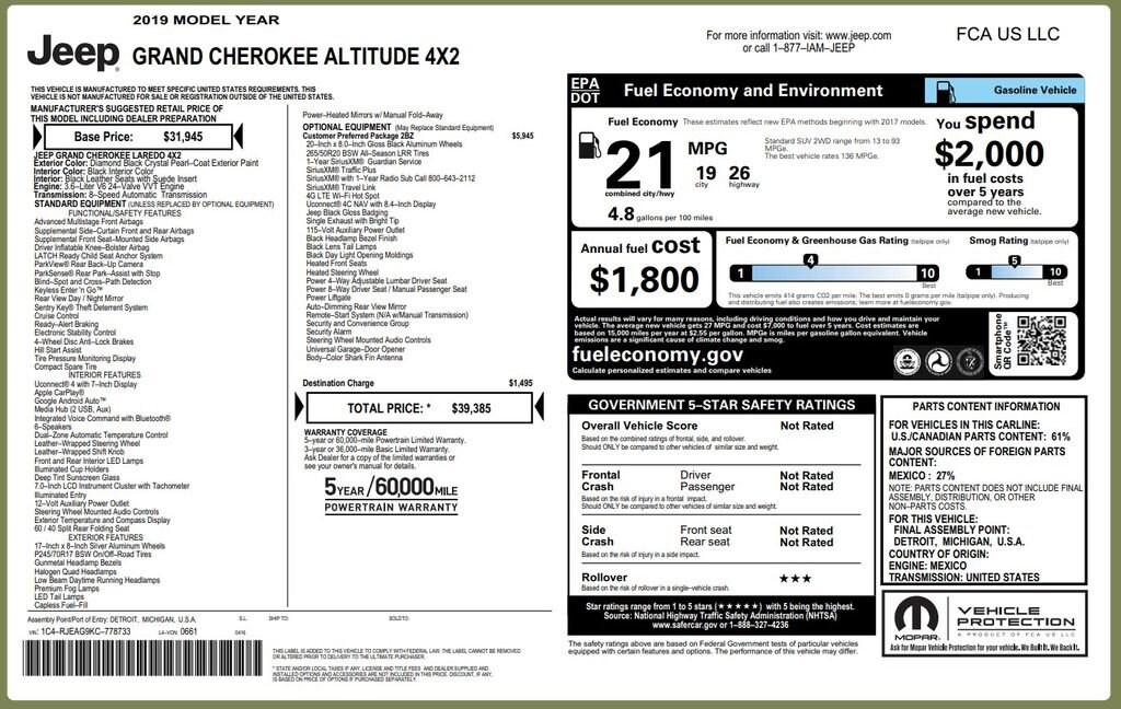 2019 Jeep Grand Cherokee Altitude features a 3.6Liter V6 24Valve VVT Engine with a Customer Preferred Package 2BZ ($5,945 option)