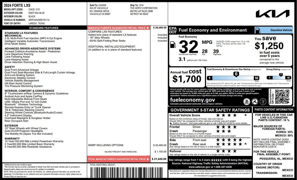 2024 Kia Forte LXS features a 2.0L Multi-Point Fuel Injection (MPI) 4-Cyl Engine!