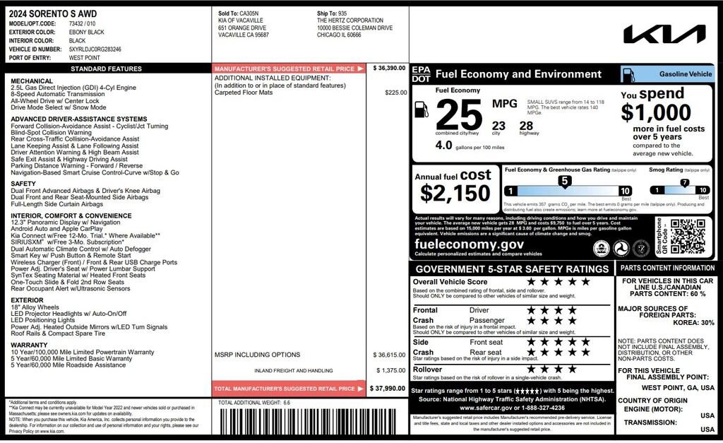 2024 Kia Sorento S features a 2.5L Gas Direct Injection (GDI) 4-Cyl Engine!