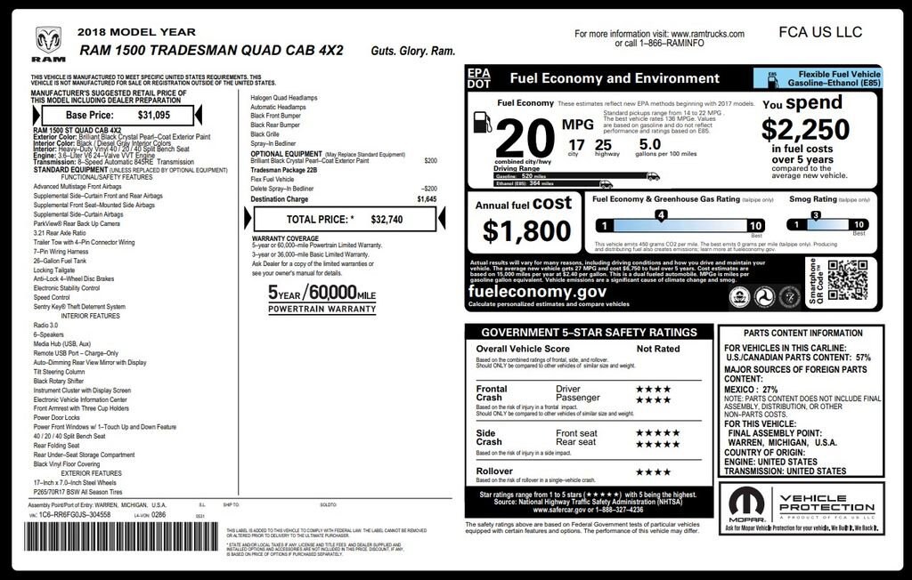 2018 Ram 1500 Tradesman features a 3.6Liter V6 24Valve VVT Engine!